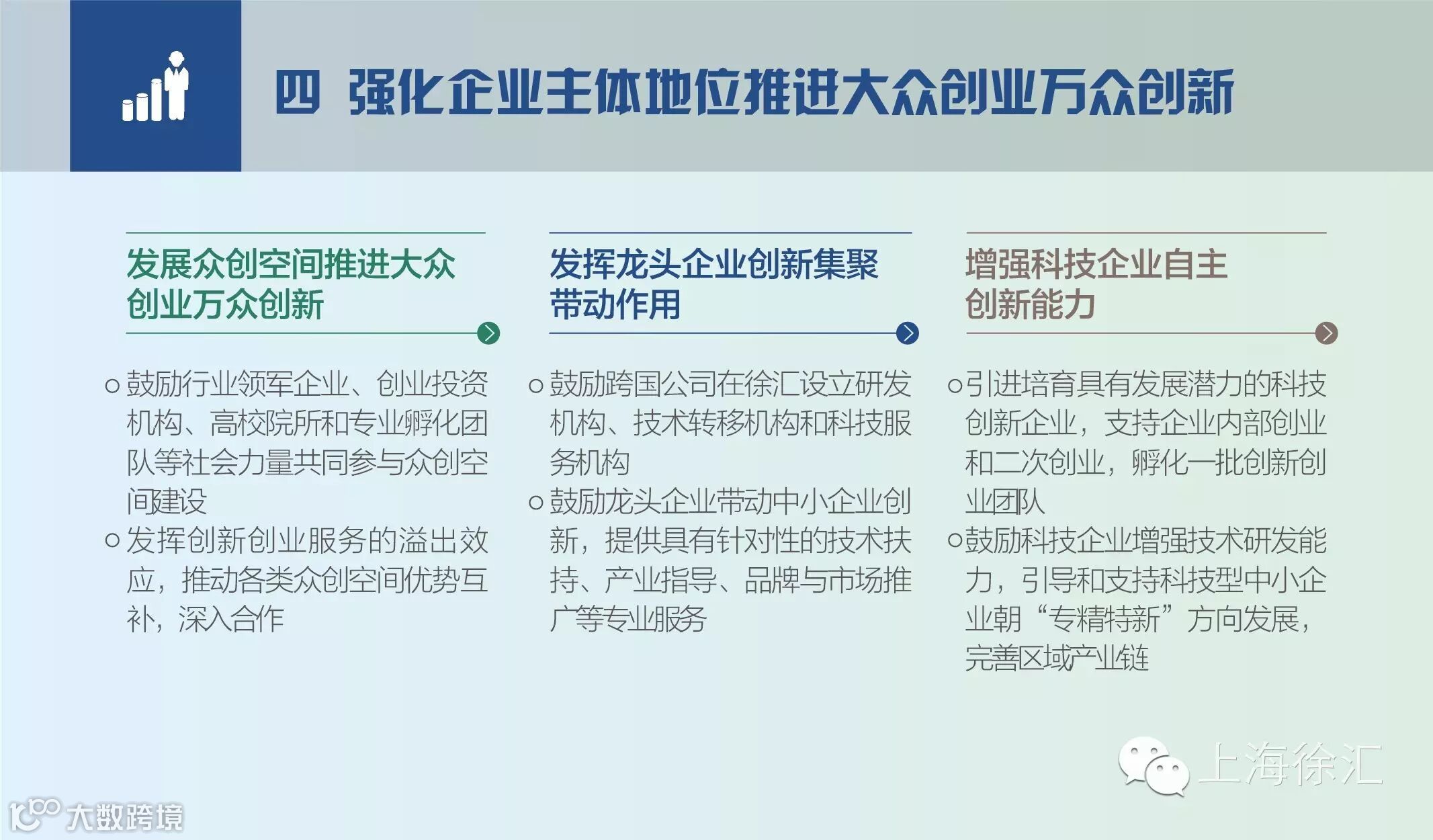 鼓励龙头企业带动中小企业创新,提供具有针对性的技术扶持、产业指导、品牌与市场推广等专业服务。支持强生全球创新中心建设,建立生命健康产业协同创新基地。支持腾讯上海创业基地建设,打造集“孵化+投资+产业资源”一体化的创新创业中心。