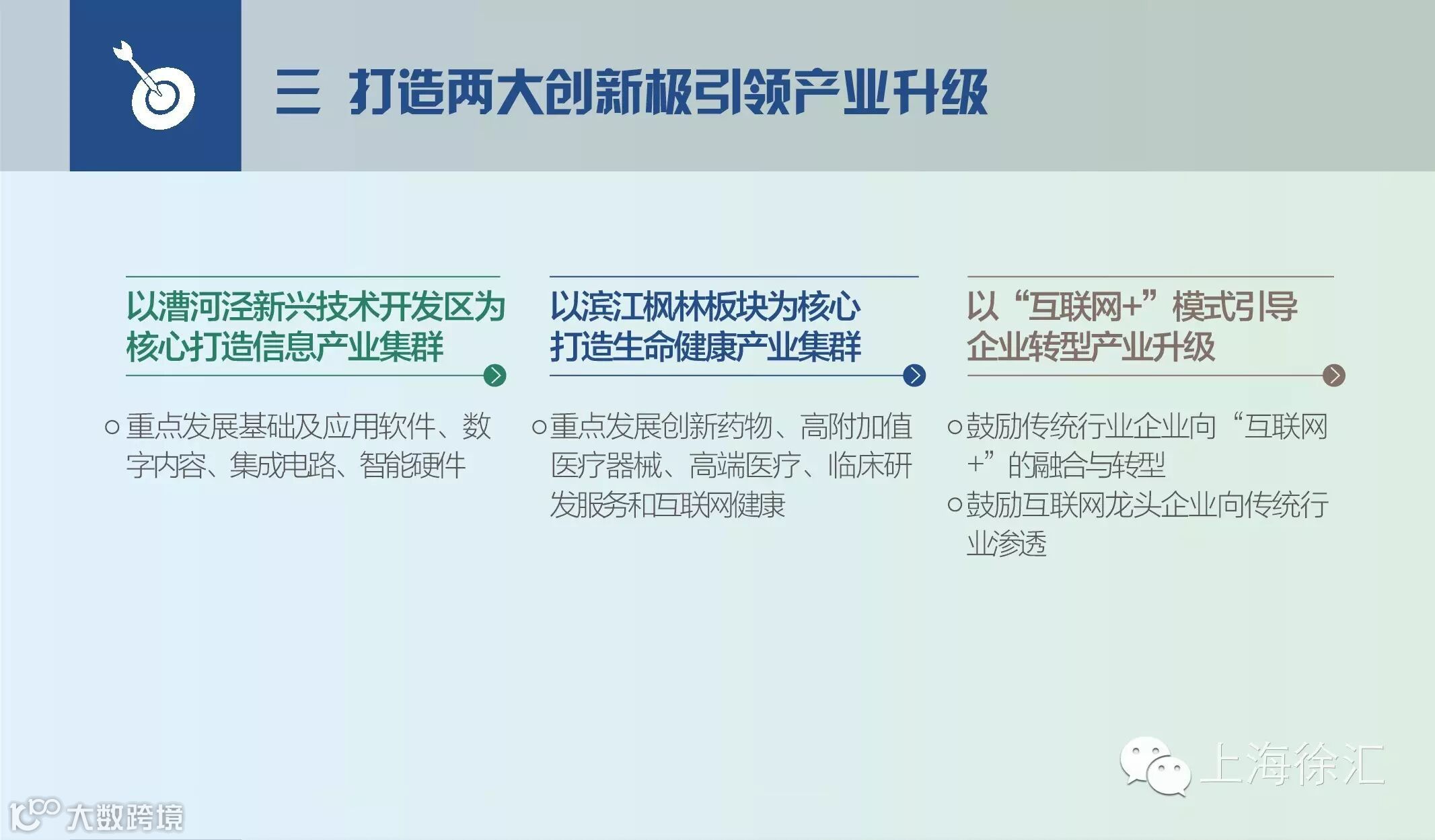加快推进以信息产业为重点的漕河泾新兴技术开发区和以生命健康产业为重点的滨江枫林生命健康产业集聚区建设。科学编制功能形态规划,增强区域复合功能,与周边片区协作联动,打造彰显徐汇科技产业特色和领先地位的核心区域。