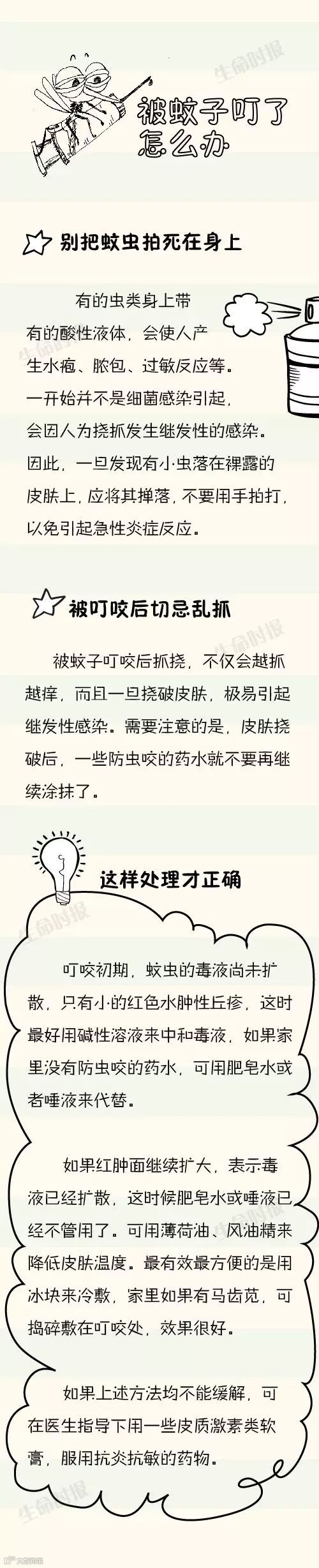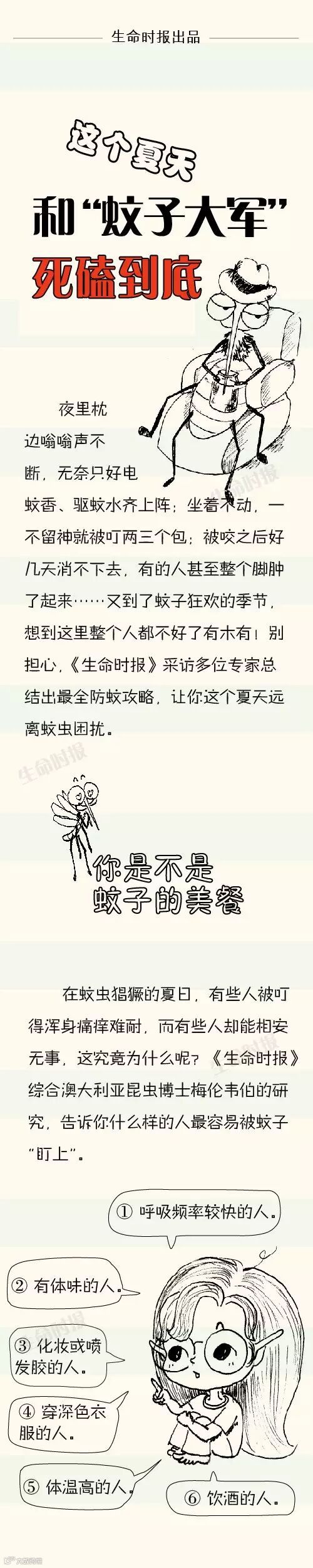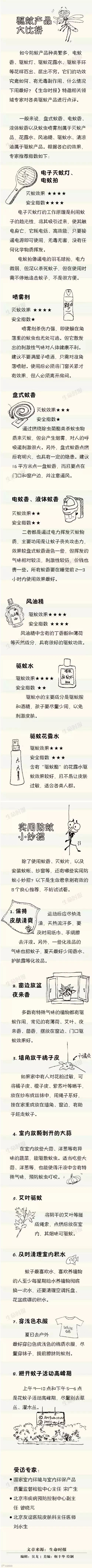 【导读】 对很多人来说,夏天最可怕的不是高温,也不是剧烈的阳光,而是只闻其声不见其蚊的“嗡嗡大军”们。又到了蚊子狂欢的季节,想到这里整个人都不好了有木有!别担心,《生命时报》采访专家总结一套最全防蚊攻略,戳图学习↓ |