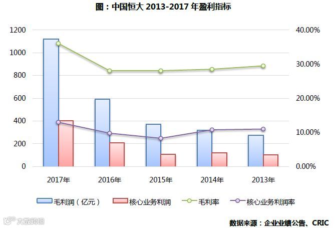 恒大2017年净利润370.5亿,同比增110.3%;净利率11.9%,同比上升3.6个百分点。核心净利润大幅上升95%至405.1亿元,5年平均复合增长率达41%,超越原来利润之王中海地产,成为新的利润之王。恒大2017年核心净利润率达13.0%,较2016年上升3.2个百分点。另外,得益于2017年交付物业增加、毛利率上升及有效销售、管理成本的控制等,恒大归母净利润上升至243.7亿元,同比增长逾370%。