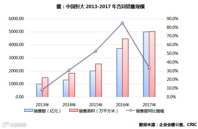 2017年中国恒大销售规模保持适度增长,实现合约销售金额5009.6亿元,完成全年销售目标的111.3%,销售面积达5029.9万平方米,同比增幅分别达34.2%和12.6%,位列2017年销售榜榜单三甲,刷新恒大有史以来最高销售记录。销售规模的增长主要得益于恒大不断提升产品附加值,庞大的在售项目资源和可售货源及扎实的销售策略等。