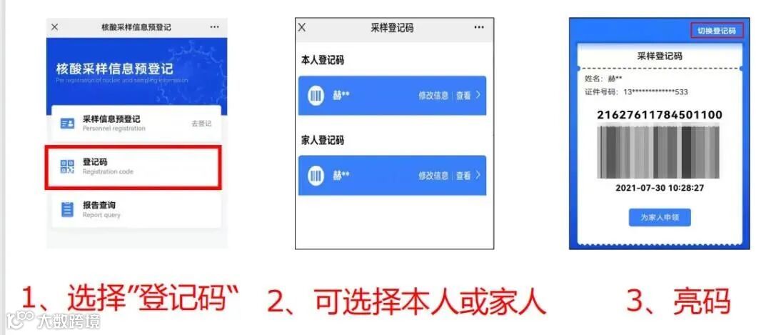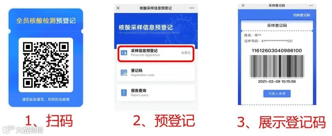 市民通过移动终端扫描采集点的二维码进行预登记,填报个人或家人信息,领取采样登记码,预约检测点的核酸采集,实现患者无接触式管理,减少现场排队等待时间。