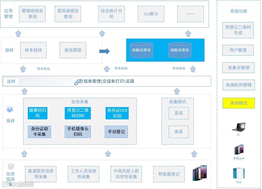 系统支持多种采集模式,为不同场景提供更灵活的采样模式。包括移动APP采集端、PC采样点(三合一设备,电脑,扫码枪,读卡器)、PDA(扫描枪与身份证读卡)。