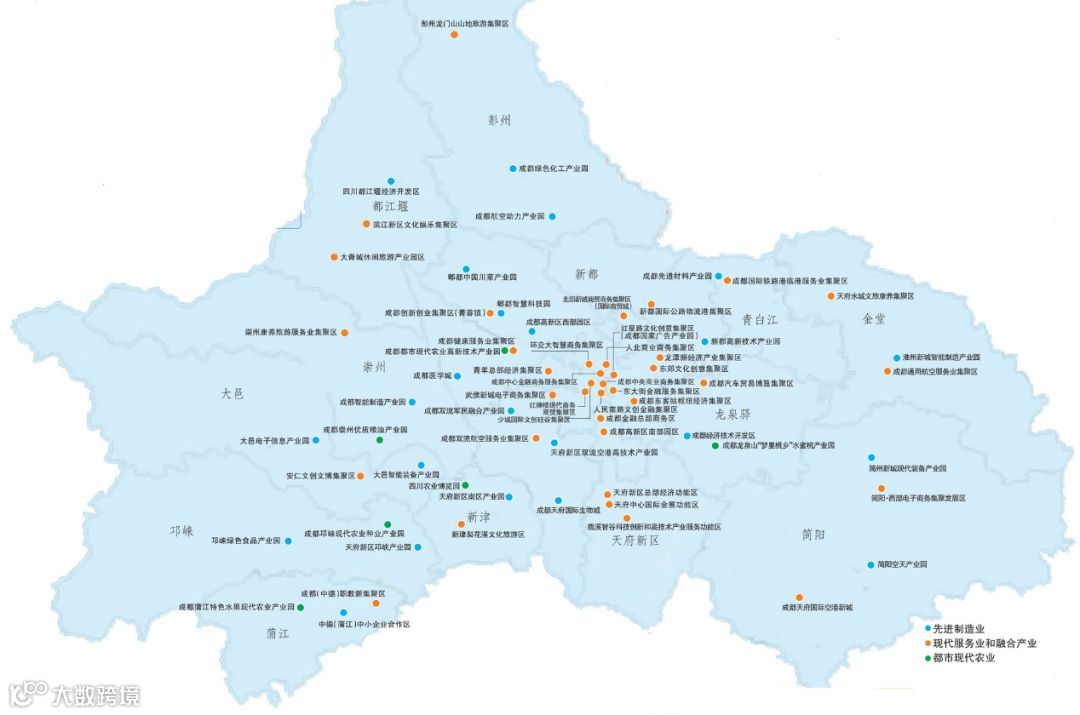 全成都市统筹布局建设66个主导产业明确、专业分工合理的产业功能区,全面提升城市能级。这66个产业功能区地理分布见下图。