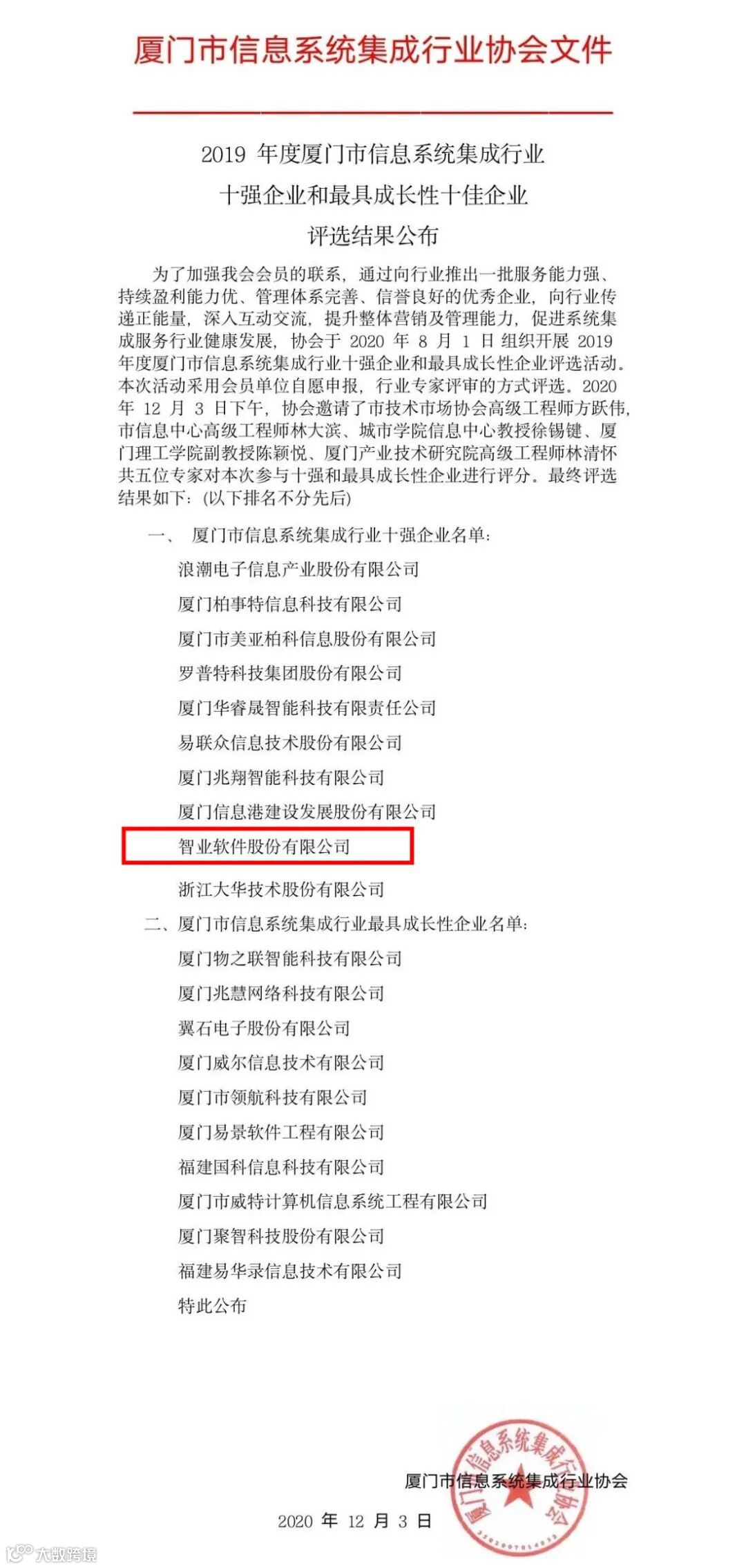 近日,2019年度厦门市信息系统集成行业十强企业和最具成长性企业评选结果出炉,智业软件成功入选十强企业名单!