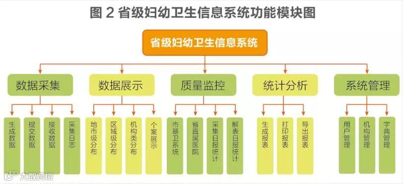 省级妇幼卫生信息系统主要包括以下功能模块:数据采集、数据质量监控、数据展示、统计分析和系统管理,系统的功能模块如图2所示。