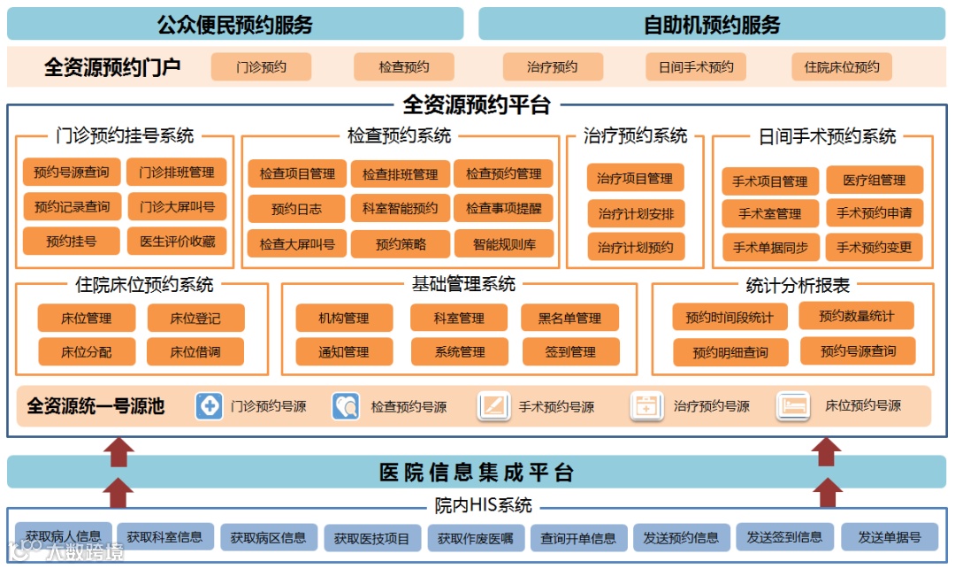 智业全资源预约平台整合院内的预约资源,建设统一号源池对号源进行统一管理,提供全资源预约门户,集合门诊挂号、检查、治疗、日间手术、住院床位等院内预约系统,提供给医院客服中心、导诊台等统一的预约入口,可根据病人的需求进行快速预约,节省了多个预约系统来回跳转的时间,减少病人往返多个科室、导诊台进行不同业务预约的时间,提高了整体的预约效率。