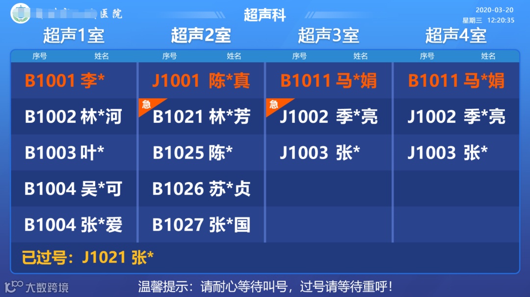 叫号系统提供线下就医签到服务,帮助科室有序排队,实时同步分诊排队信息,并与大屏系统联动。大屏叫号系统可选择统一资源分配模式、诊前准备模式、常规模式等,多种模式组合可解决诊室各种错综复杂的叫号问题,诊室可根据自身的情况选择合适的叫号模式。同时,大屏叫号结合挂起、优先、共享叫号的模式可以帮助医技科室合理、有序、科学地叫号。