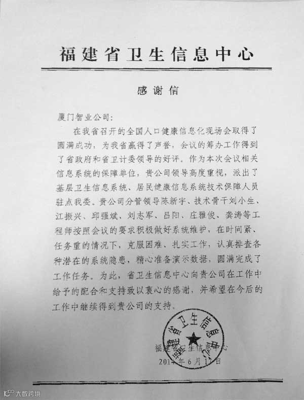 近日,在我省召开的全国人口健康信息化现场会取得了圆满成功。作为本次会议相关信息系统的保障单位,智业软件收到福建省卫生信息中心的感谢信,感谢分管领导陈新宇、技术骨干刘小生、江振兴、邱强斌、刘志军、吕阳、庄雅俊、龚涛等工程师按照会议的要求积极做好系统维护,在时间紧、任务重的情况下,克服困难、扎实工作,认真排查各种潜在的系统隐患,精心准备演示数据,圆满完成工作任务。特此至信表示感谢!