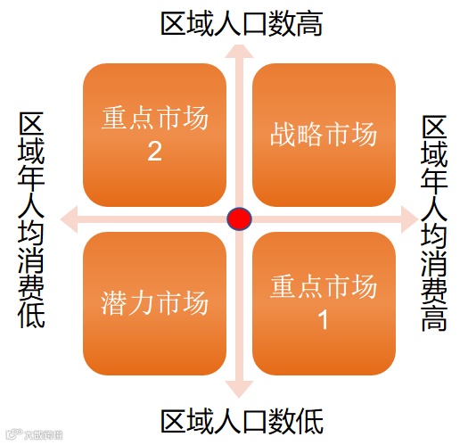 一般情况下,我建议品牌商按照市场的人口数量、年人均消费金额这两个指标进行初步的市场切分。这样可以分为四类:
