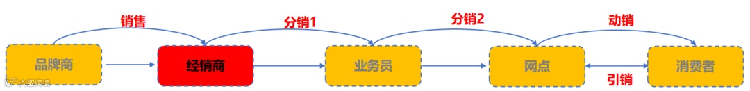 品牌商到经销商称之为销售,经销商到业务员再到网点称之为分销,网点到消费者称之为动销,消费者反过来到网点称之为引销。