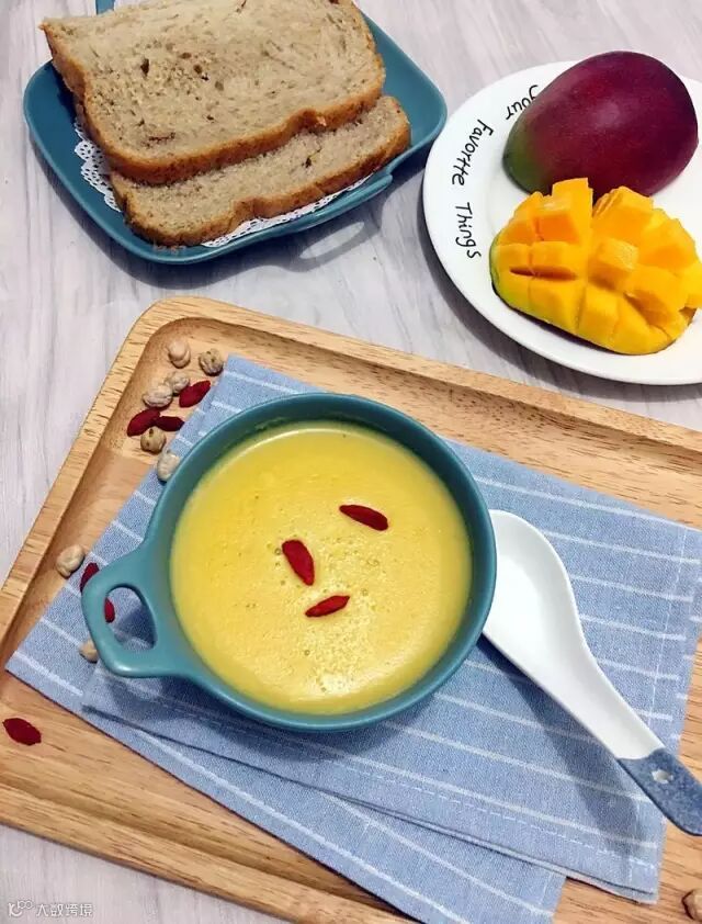 3. 做好后倒入碗中即可食用。金黄色的米糊,中间一会儿就结了一层厚厚的营养米皮。早餐搭配酸奶全麦面包非常棒哦!