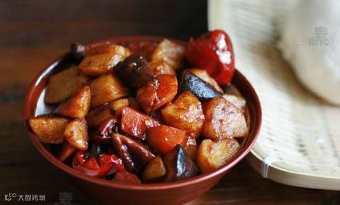 材料:土豆2个、胡萝卜1根、香菇5朵、盐1/2小匙、老抽2大匙、枫糖少量、八角1个