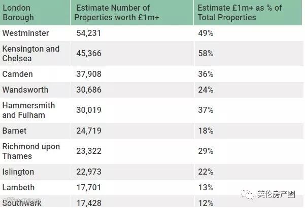 该网站还专门以百万英镑以上房产数量,做了两份排名榜单(伦敦和除伦敦以外地区)。