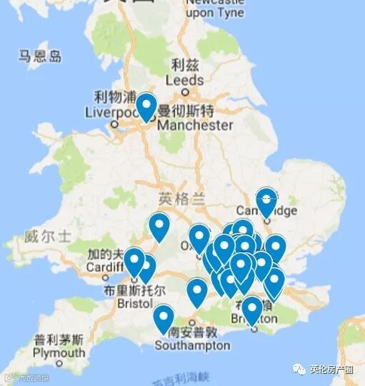 在伦敦以外的地区中,百万房产集中分布在英格兰东部和英格兰东南(图中蓝点标示)。