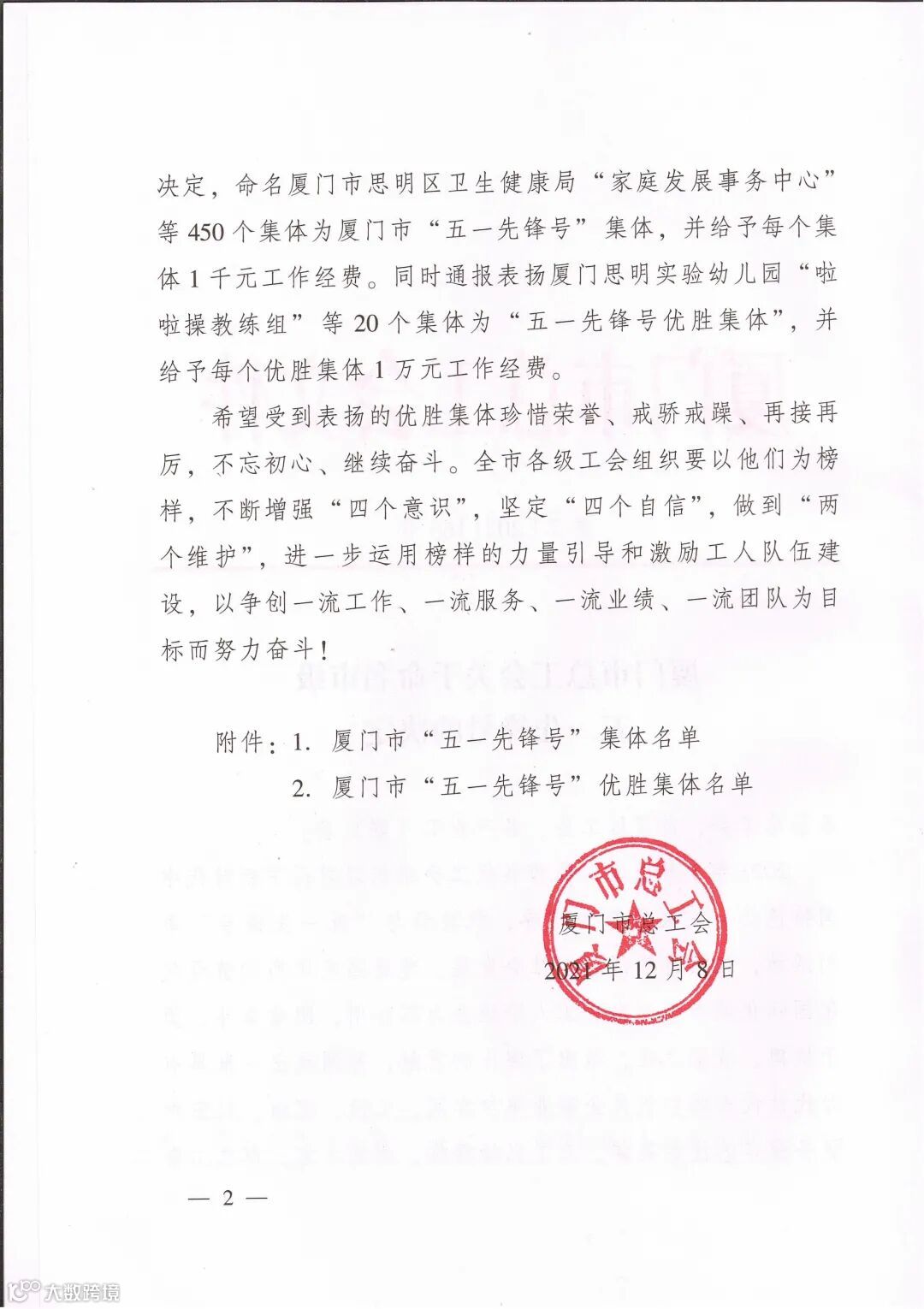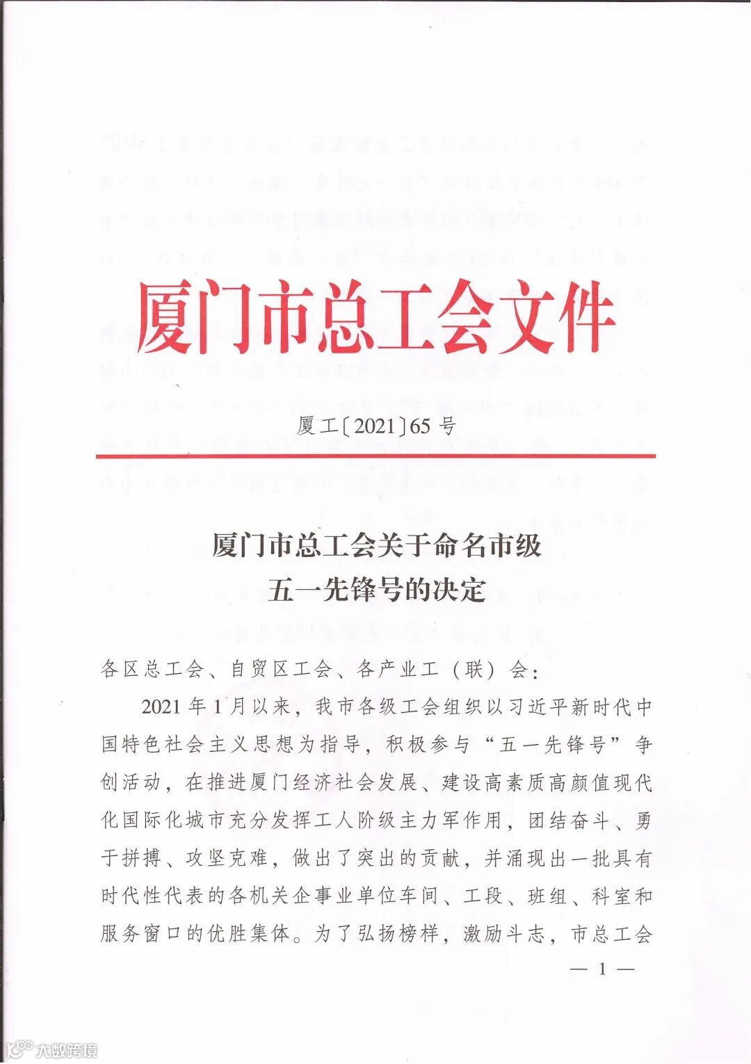弘扬榜样,激励斗志。据悉,厦门市“五一先锋号”争创活动旨在推进厦门经济社会发展、建设高素质高颜值现代化国际化城市中充分发挥工人阶级主力军作用,展示团结奋斗、勇于拼搏、攻坚克难,及做出突出贡献。