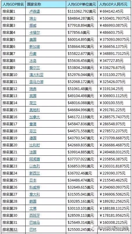 排名前十的基本都是发达国家,美国不仅GDP总量大,人均GDP也高,香港排名第17,实力还是很强的。