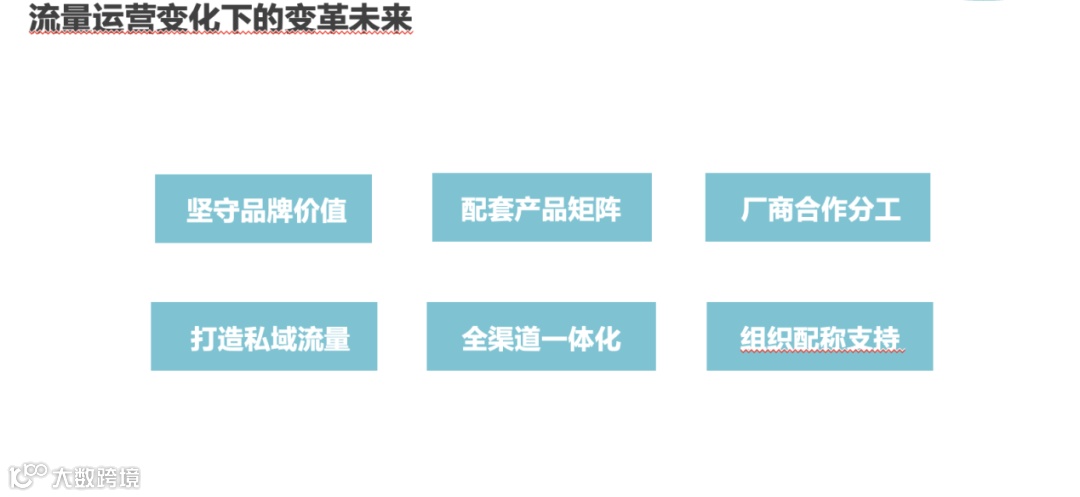 流量运营变化下的变革未来,我认为坚守品牌价值、配套产品矩阵、厂商合作分工是中短期的未来,打造私域流量、全渠道一体化、组织配称支持是中长期的未来。