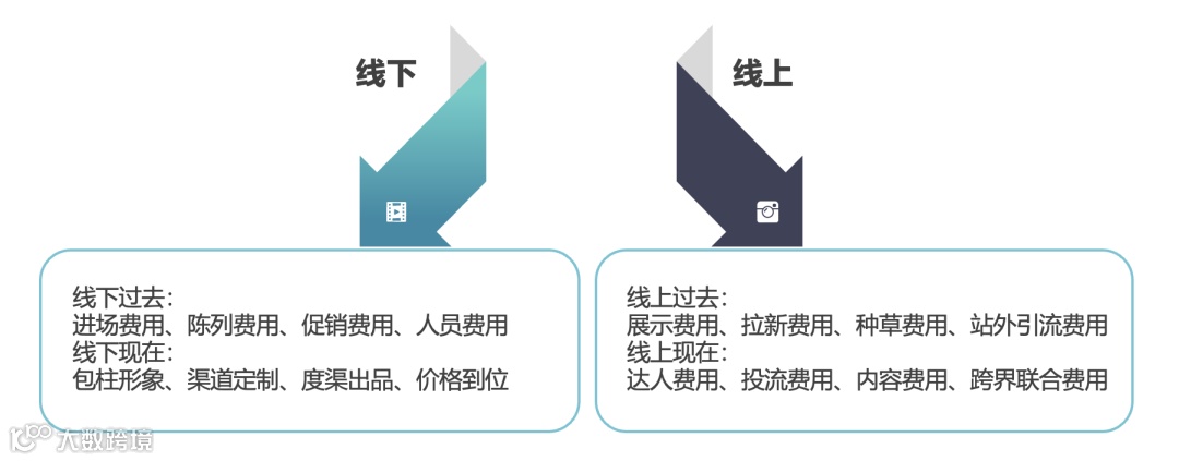 新的流量投入,线下过去是进场费用、陈列费用、促销费用、人员费用,这是人海战术,我们统称为通道费用。过去所有线下的商超卖场,赚的是通道费用。