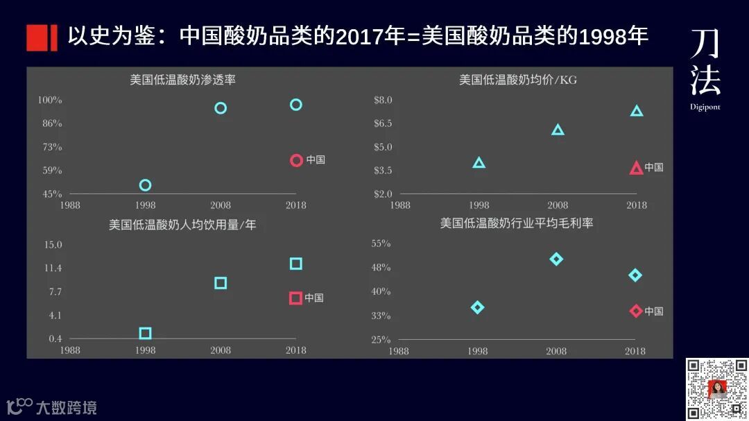 对标发现,2017 年中国低温酸奶的均价、毛利率相当于美国的 1998 年,人均饮用量相对于美国的 2008 年,所以你无法把 2018 年的东西带进来。看到这里,相信大家对前面两个品牌怎么样挂掉也有更清晰的体感。
