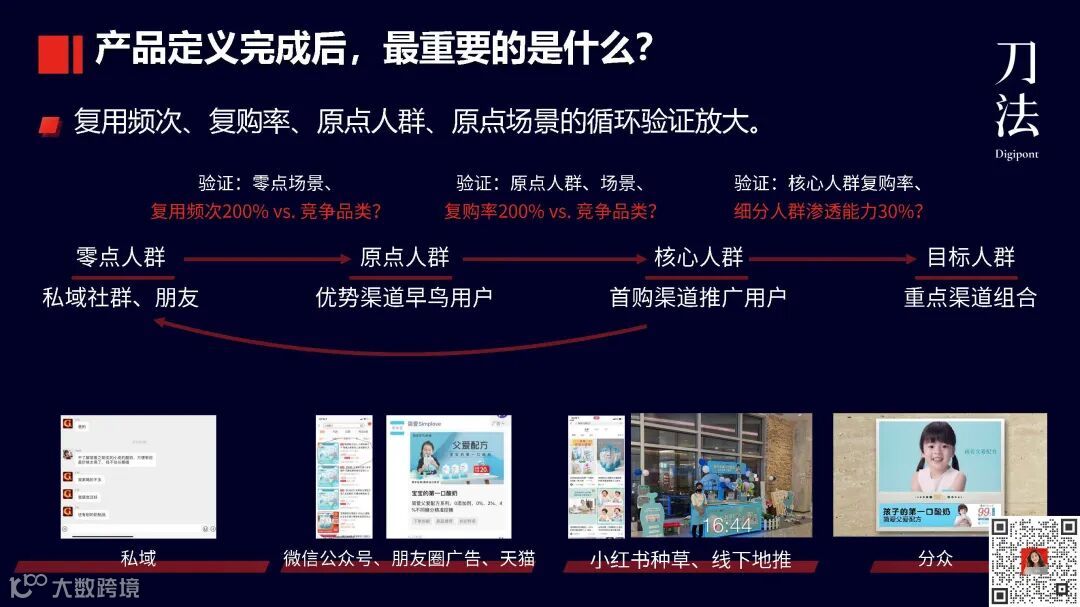 父爱配方在朋友圈广告、公众号、天猫投流,找购买的原点人群,然后去看他们的复购率。如果复购率没有吊打目标竞争品类 200%,也不要往下走。