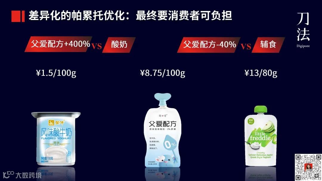 举例来看。父爱配方虽然比传统酸奶高出了 400%,但他的场景其实对标的是孩子的辅食。这样一比它是便宜的,那就没关系。