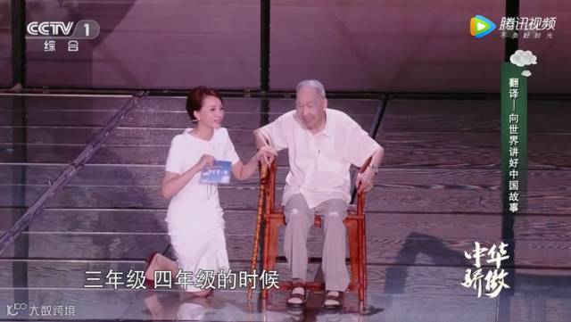 ▲《开学第一课》中,在和老翻译家对话时,董卿贴心的跪在地板上认真听老翻译家说话(图/视频截图)