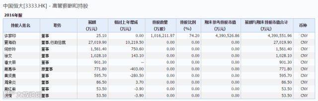 据恒大2016年年报显示,执行董事中,年薪最高的是副总裁何妙玲的1561.4万元,另外金融集团的常务副总裁谢惠华的年薪是771.8万元,CFO潘大荣的年薪为901.3万元。