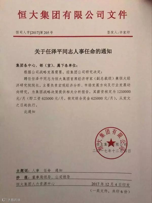 这封由恒大集团主席许家印签发的人事任命通知显示,任泽平将主要负责宏观经济分析、市场发展方向及行业发展动向的研究,为集团战略决策提供相关分析报告,其薪资核定为1250000元/月(即工资625000元/月,核定综合奖金625000元/月),从发文之日(12月4日)起执行。