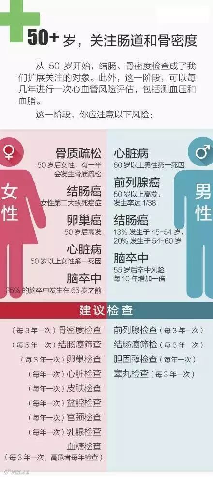 中老年人:由于身体机能的下滑,中老年人群的健康状况开始进入“多事之秋”,体检的间隔时间应逐渐缩短。40到50岁的人群属于各类疾病的高危人群,每年务必体检一次。60岁以上有慢性病以及疾病家族史的人群,建议每年两次体检。