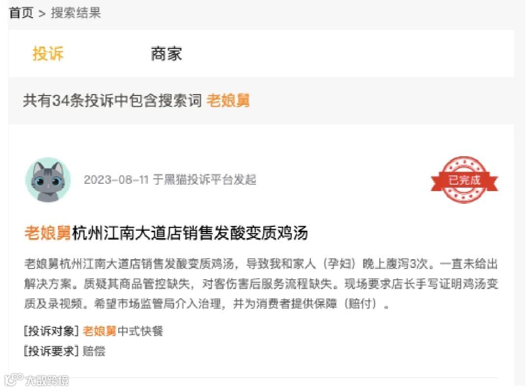 除了监管关注,消费者也时常吐槽。在“黑猫投诉”搜索“老娘舅”,有消费者提出包括但不限于鸡汤变质、售卖的大米出现霉块、吃到虫子等问题。