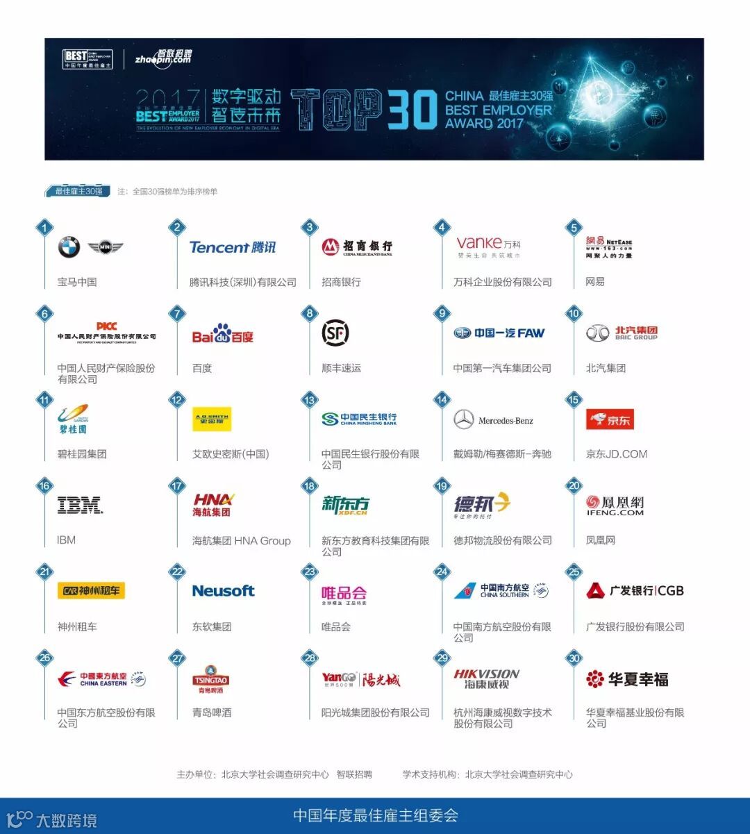 又到了一年一度年终盘点的时候,来自智联招聘联合北京大学社会调查研究中心共同发起的“中国年度最佳雇主”评选,给出了一份答案。