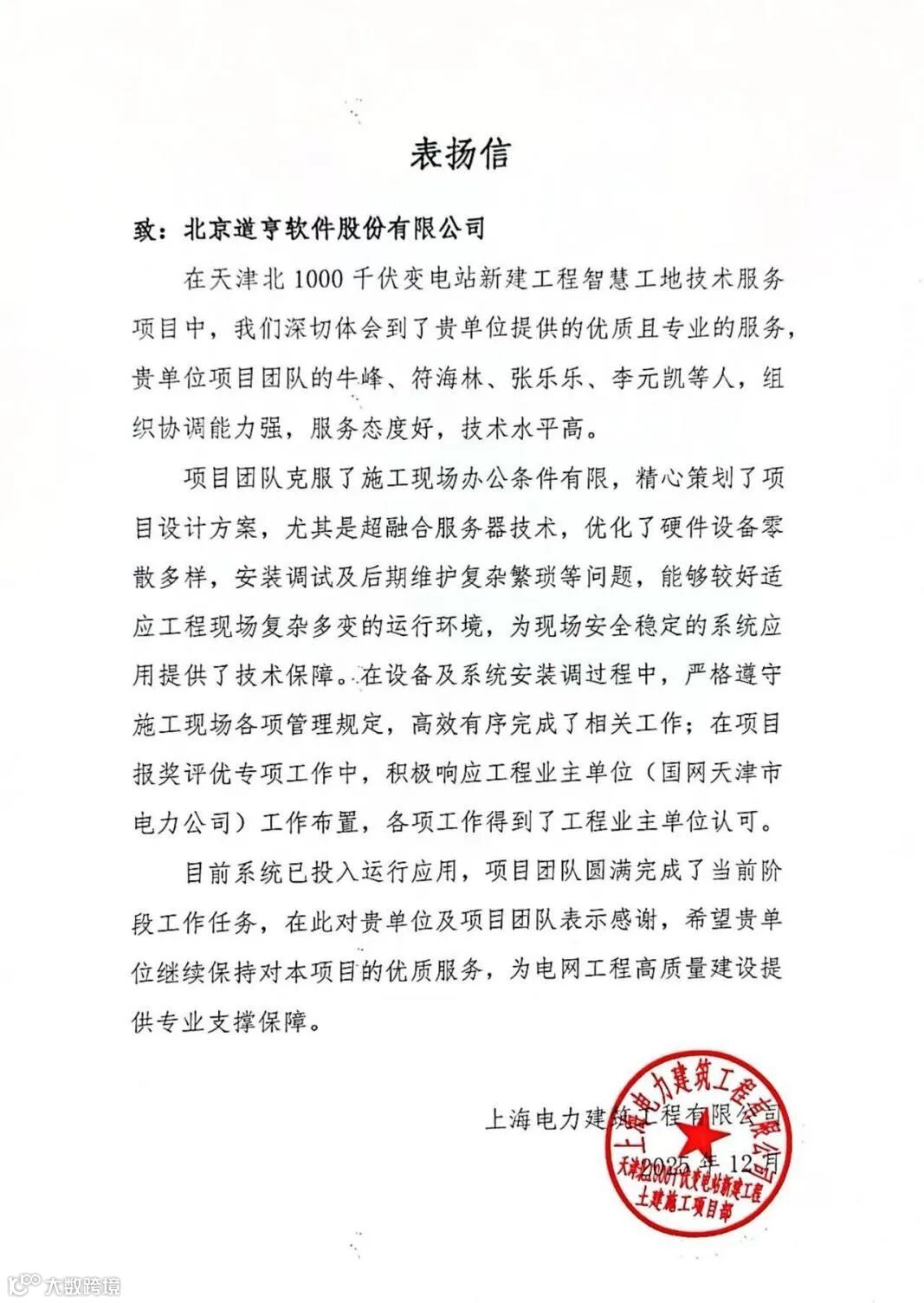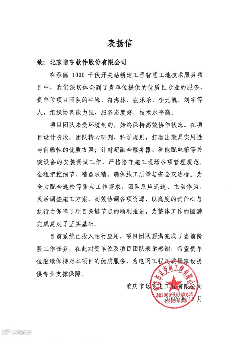 数智创新建精品 匠心服务树标杆。近日,上海电力建筑工程有限公司及重庆市送变电工程有限公司发来感谢信,对我司智慧工地团队在天津北1000千伏变电站新建工程、承德1000千伏开关站新建工程中的专业服务与技术支撑给予高度赞誉和衷心感谢。