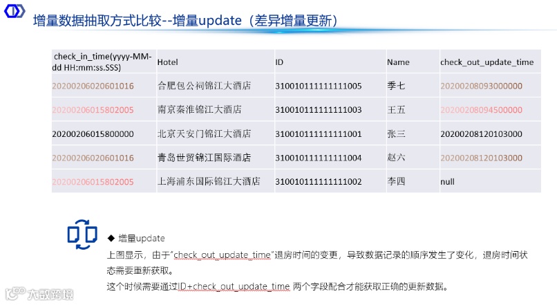 • 差异更新同步是指基于增量同步的机制基础上,能发现从数据源中已经抽取过但是却发生变化的数据(包括修改和删除),将过去已经抽取了但发生变化的数据,重新更新到目标系统或数据仓库中。其原理相对复杂,具体步骤如下: