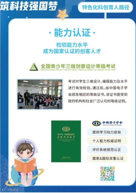 全国青少年三维创意设计等级考试是由中国电子学会(工信部直属事业单位、中科协团体会员单位)于2018年发起的面向青少年三维创意设计能力水平的社会化评价项目。旨在激发和培养青少年学习三维设计和3D打印的热情和兴趣,从三维创意设计软件的理论知识和上机操作出发,不断提升青少年的创新能力、动手实践能力和语言表达综合能力,引导青少年建立工程化、系统化的逻辑思维,受到社会广泛认可。