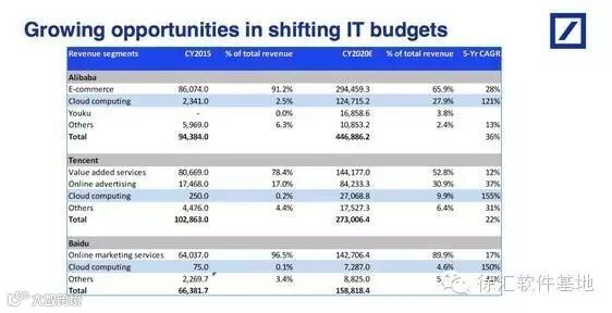 德意志银行倾向于认为阿里云会持续领跑该领域。“阿里云的主导地位仍会持续,尽管新入市的腾讯和百度从现在到2020年应该也会继续增长。”