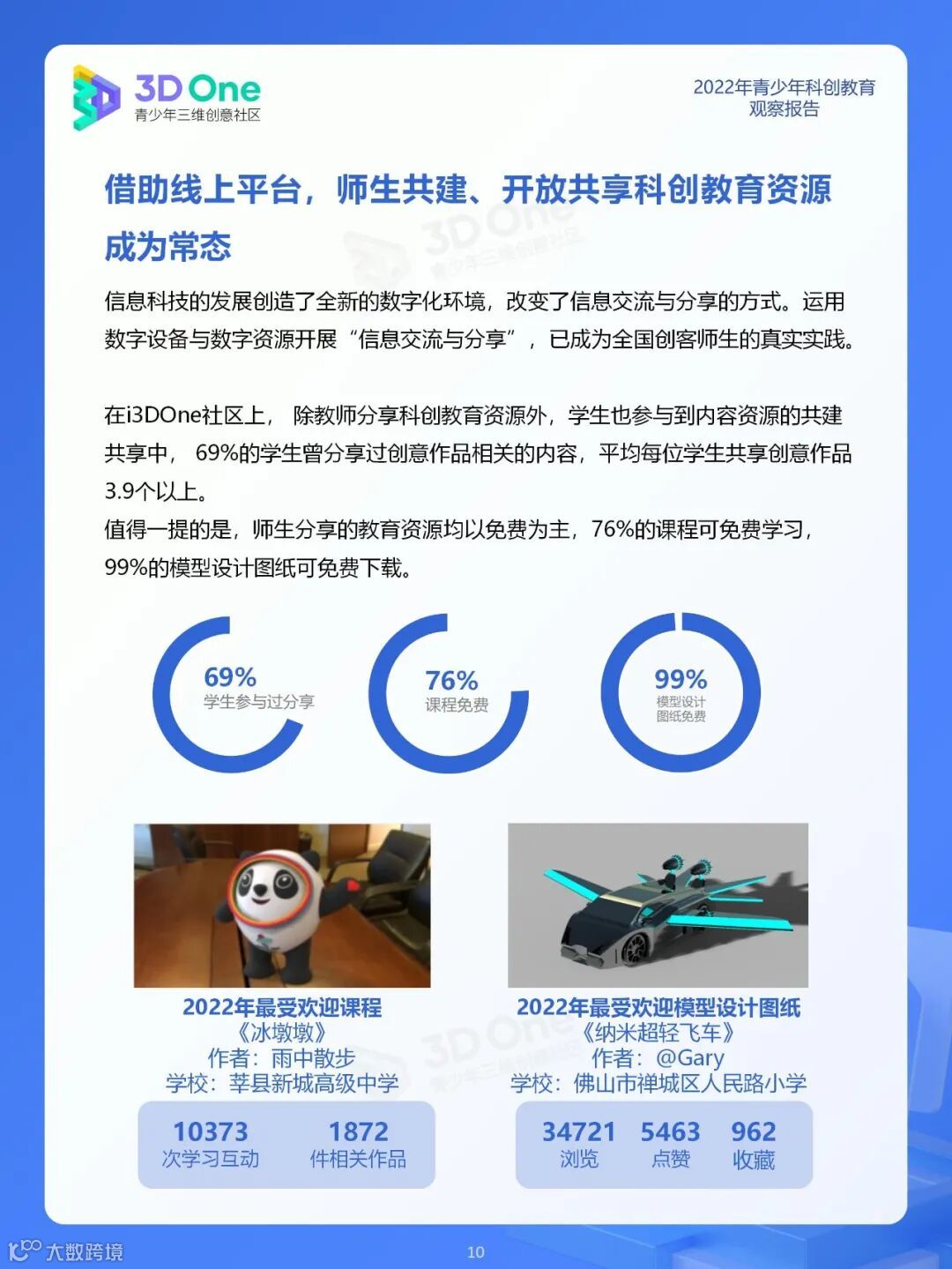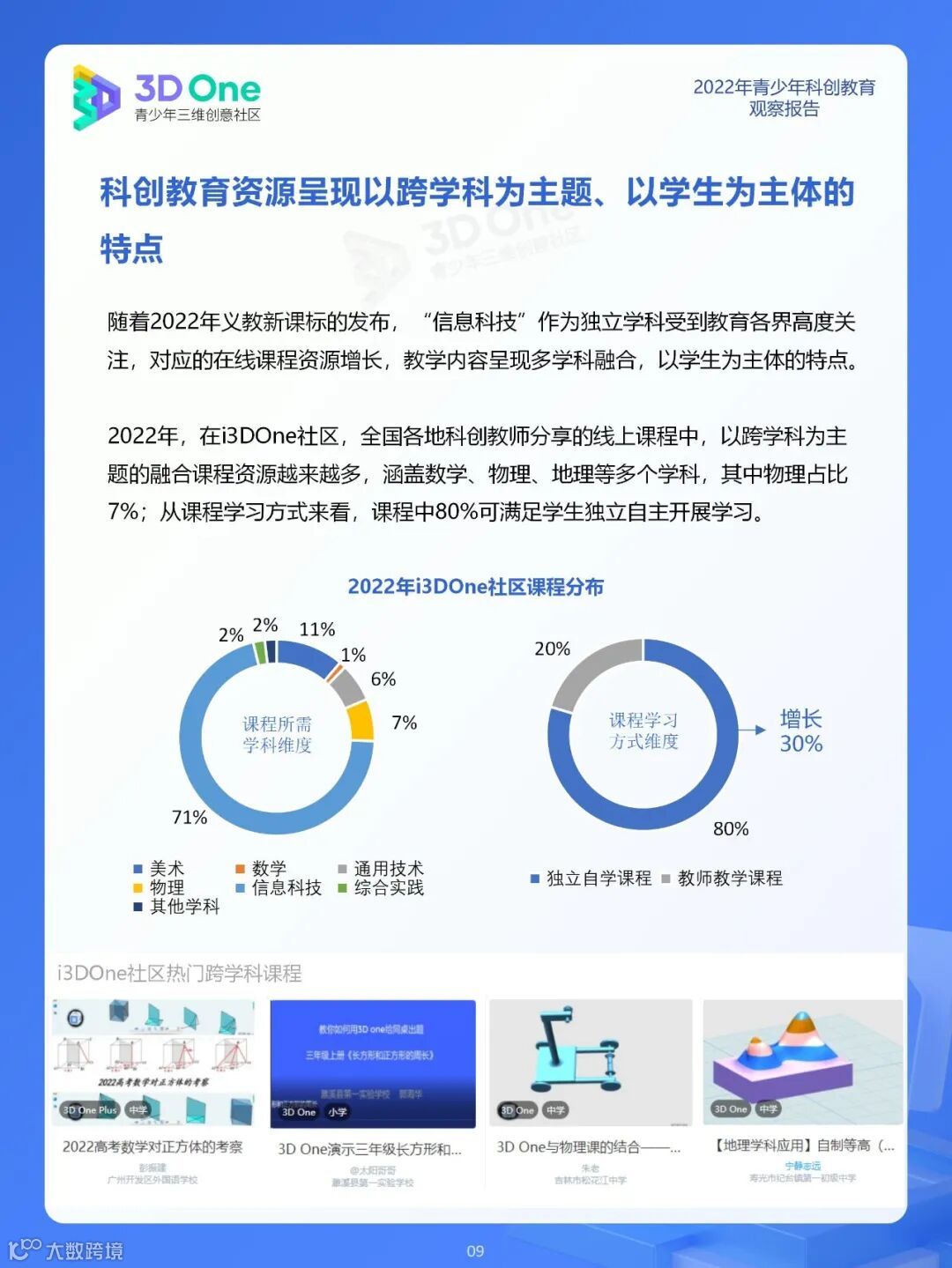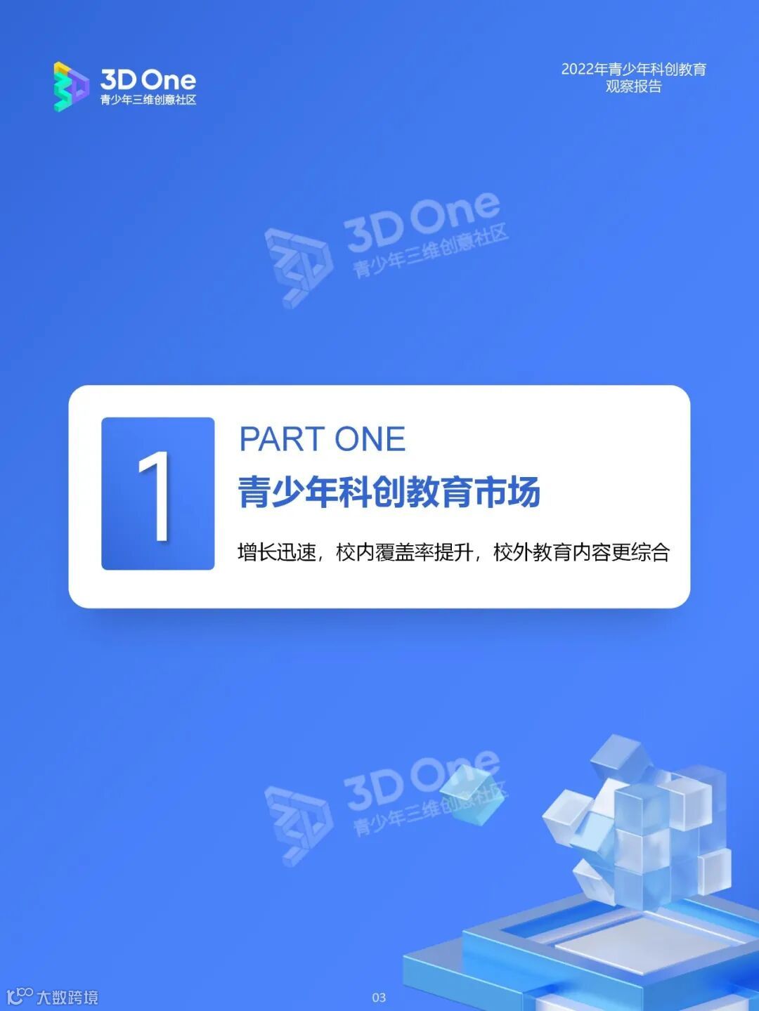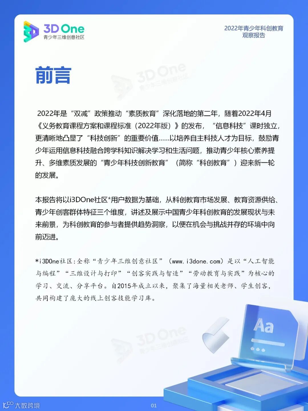 为帮助科创教育相关从业者在持续发展的时代中找到应对方式,同时在不断变换的浪潮中发掘自身价值创造新机遇, i3DOne社区特发布「2022年青少年科创教育观察报告」,希望在2023年初规划、展望之际,从青少年科创教育市场、教育资源及青少年创客人群特征三个方面,为科创教育的参与者提供方向参考。
