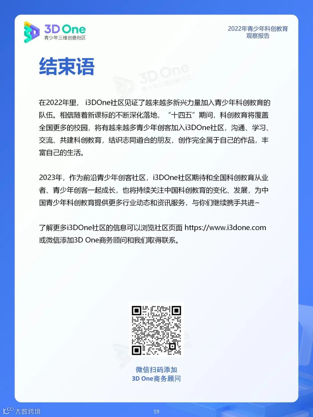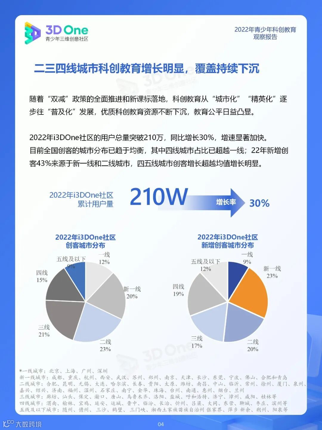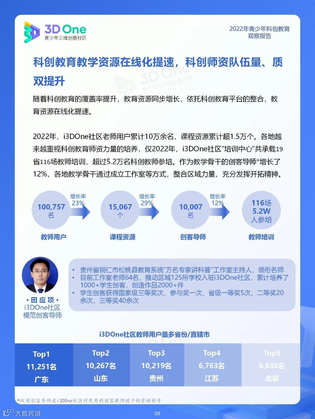 为帮助科创教育相关从业者在持续发展的时代中找到应对方式,同时在不断变换的浪潮中发掘自身价值创造新机遇, i3DOne社区特发布「2022年青少年科创教育观察报告」,希望在2023年初规划、展望之际,从青少年科创教育市场、教育资源及青少年创客人群特征三个方面,为科创教育的参与者提供方向参考。