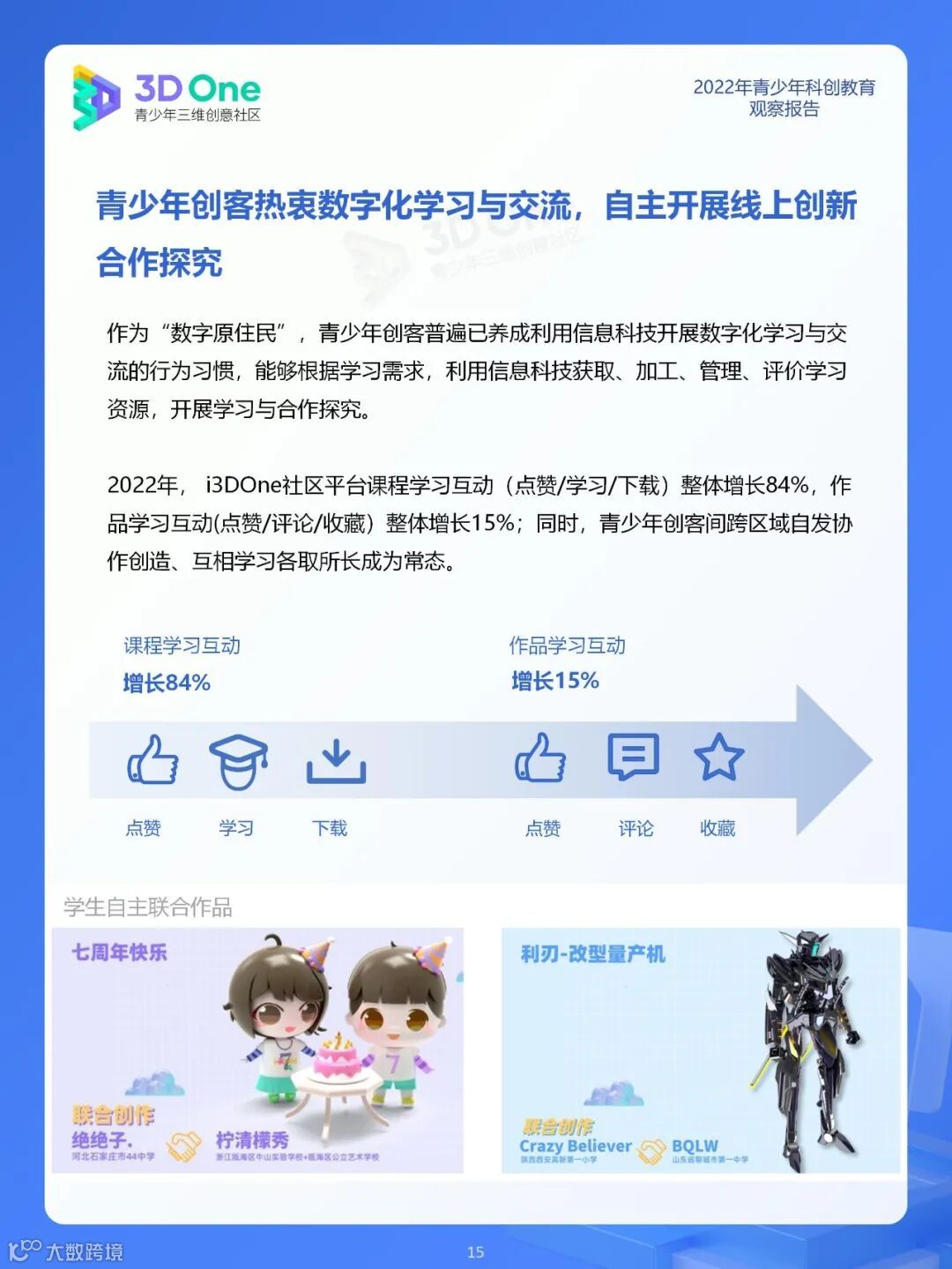 2022年i3DOne社区发展迅速,累计到12月,i3DOne社区用户数已达到210万,覆盖了全国36%的义务教育学段学校,用户累计分享原创作品量超370万。可以说,i3DOne社区见证了青少年科创教育的兴起、变革与发展。