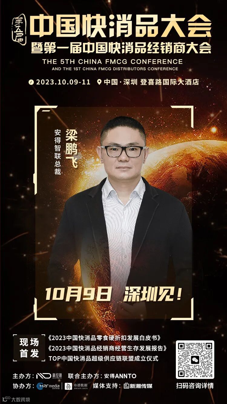 PS:2023年10月9日-11日,由新经销主办、安得智联联合主办的第五届中国快消品大会暨第一届中国快消品经销商大会将在深圳盛大举行;第一届中国快消品经销商大会将由舟谱数据联合主办;即时零售论坛专场将由合印网络联合主办。