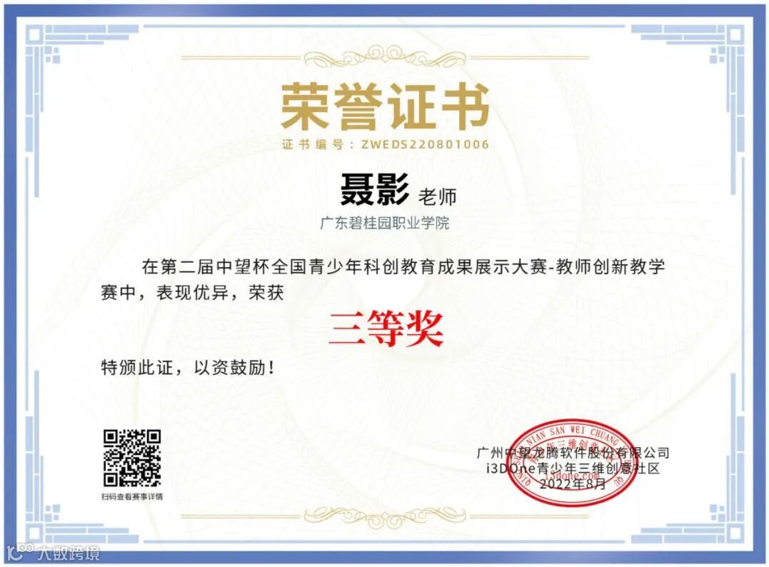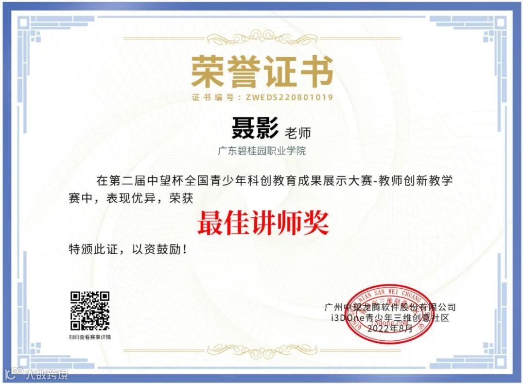 大家好,我是广东碧桂园职业学院的老师聂影。很荣幸能够有此次获奖心得的投稿机会。在此次第2届“中望杯”全国青少年科创教育成果展示大赛—教师创新教学设计赛中荣获三等奖,以及最佳讲师奖,我本人感到非常荣幸。