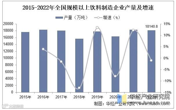 2015-2021年全国规模以上饮料制造企业产量及增速