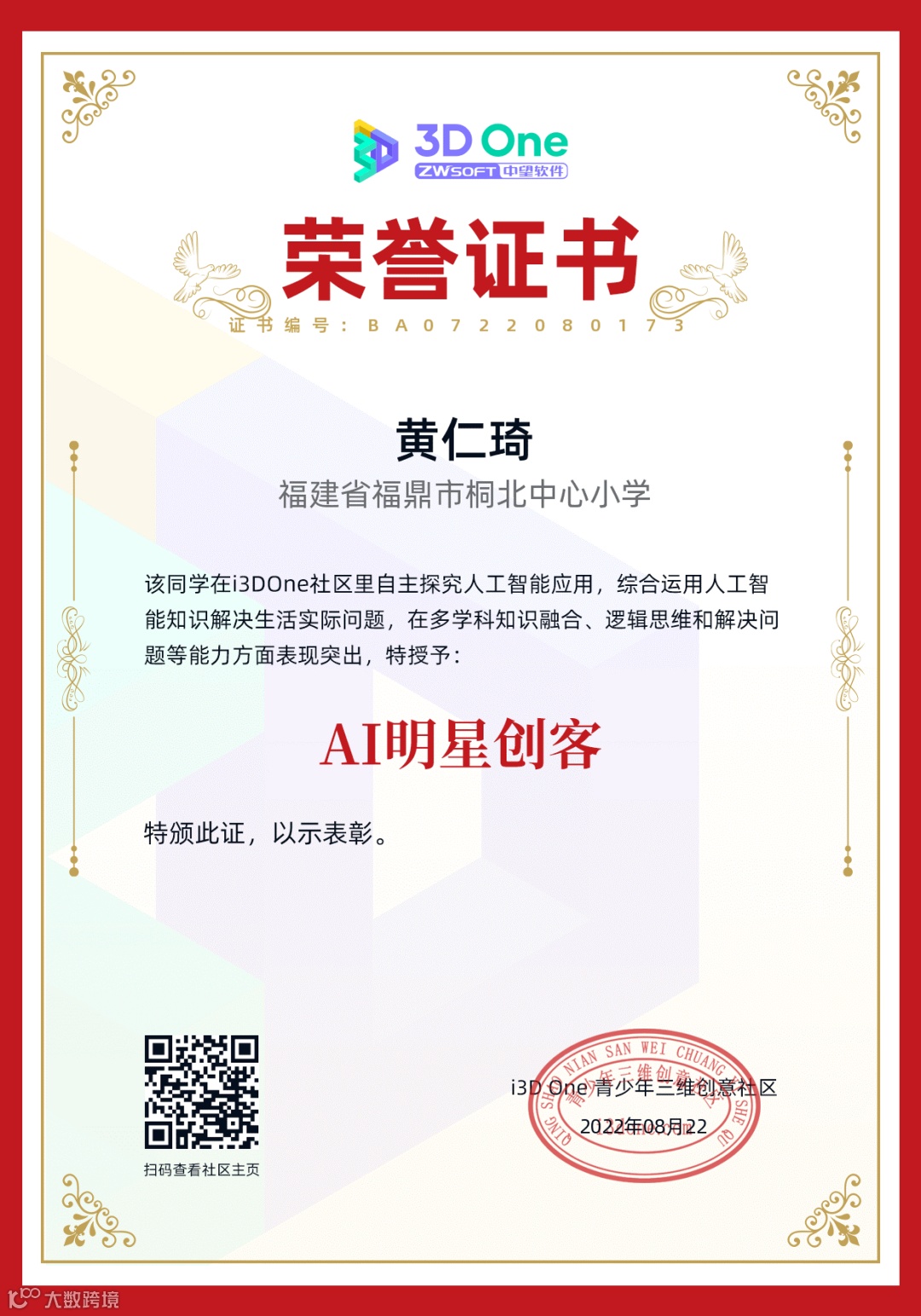 为了让自己熟悉3D One AI这个软件的操作,创作有创意的作品,我常常利用课后时间主动地学习,通过查看i3DOne社区里关于3D One AI软件教程的视频,从而增强自己对3D One AI软件的熟练度。经过短短一个学期的努力,我成功参与了12关3D One AI趣味活动,拿到了2461分的体验成绩,并获得了i3DOne社区颁发的“AI明星创客”荣誉称号,这对我是极大的鼓励和肯定。