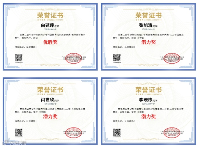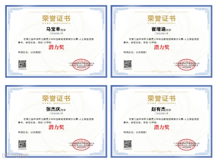 (3)2022年7名同学在第2届中望杯全国青少年科创教育成果展示大赛-人工智能竞技赛中荣获小学组“潜力奖”。