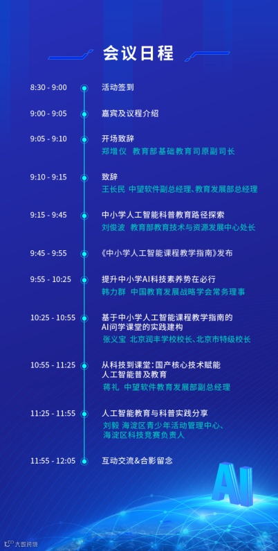 本次论坛邀请到教育部基础教育司原副司长郑增仪、中国教育发展战略学会常务理事韩力群、北京市特级校长张义宝、海淀区科技竞赛负责人刘毅、中望软件教育发展部总经理王长民、中望软件教育发展部副总经理蒋礼等嘉宾参会,将聚焦青少年人工智能教育普及难点,共同探讨解决中小学阶段人工智能教育难开展的问题,共话青少年人工智能教育的机遇、挑战与应用实践,进一步贯彻落实国家人工智能发展战略,服务国家教育高质量发展。
