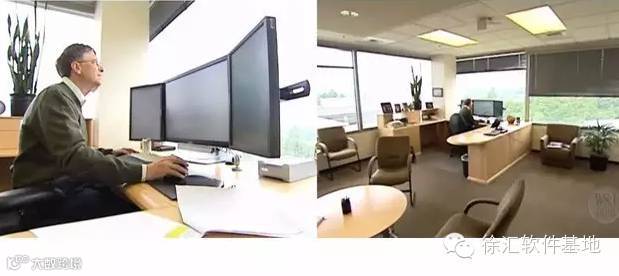 比尔盖茨的办公室装修风格非常简约,最特色的应该算桌前并排的三台显示器了,大屏、多屏算是IT控们的最爱吧。