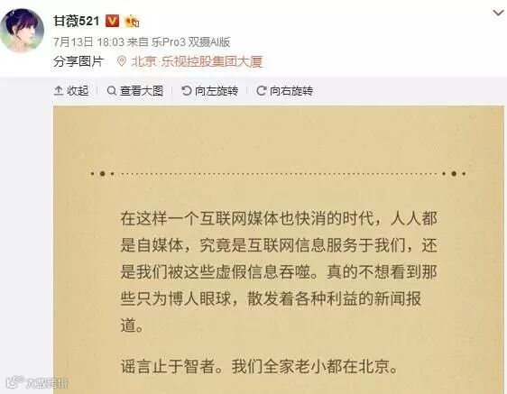 甘薇在微博中写到:在这样一个互联网媒体也快消的时代,人人都是自媒体,究竟是互联网信息服务于我们,还是我们被这些虚假信息吞噬。真的不想看到那些只为博人眼球,散发这各种利益的新闻报道。谣言止于智者。我们全家老小都在北京。