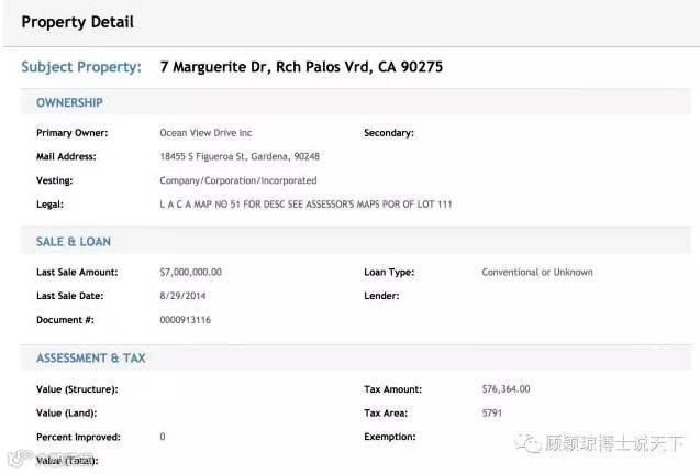 玛格丽特大道7号是2014年8月29日被加州的一个公司用七百万美金购买的。这个公司叫OceanViewDriveINC。成立于2014年8月26日,该公司的唯一控股人正是贾跃亭。