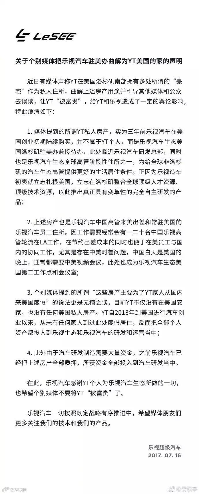 1、媒体提到的所谓贾跃亭的私人房产,实为3年前乐视汽车在美国创业初期陆续购买,并不是属于贾跃亭个人,而是乐视汽车生态在洛杉矶驻美办兼接待办;