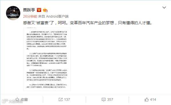 贾跃亭在其微博称:感谢又“被富贵”了,呵呵。变革百年汽车产业的梦想,只有懂得的人才懂。
